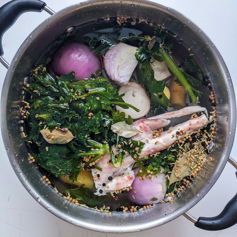 Roughly chop the veggies and place with the bones, spices and water into a large stockpot.